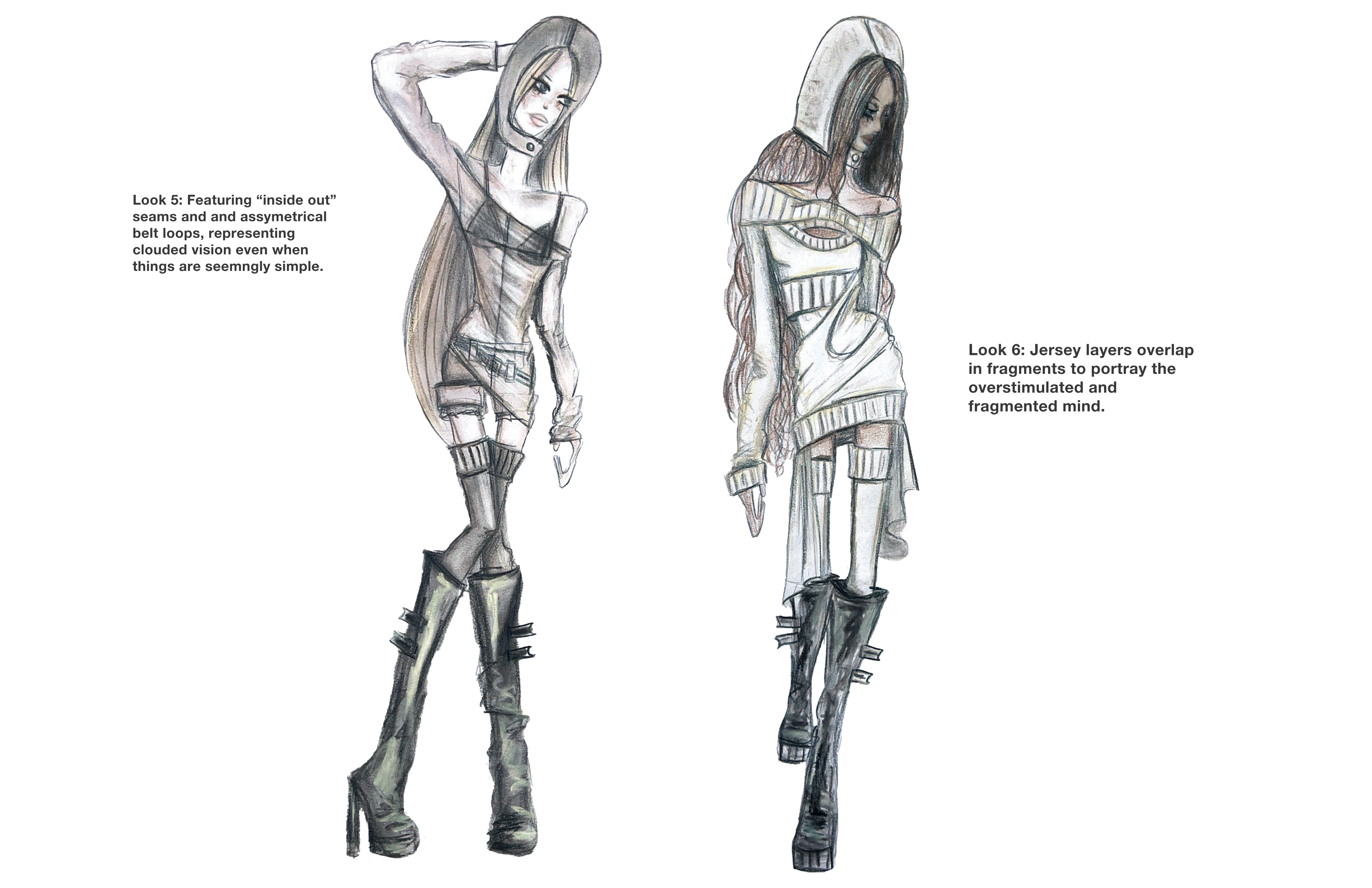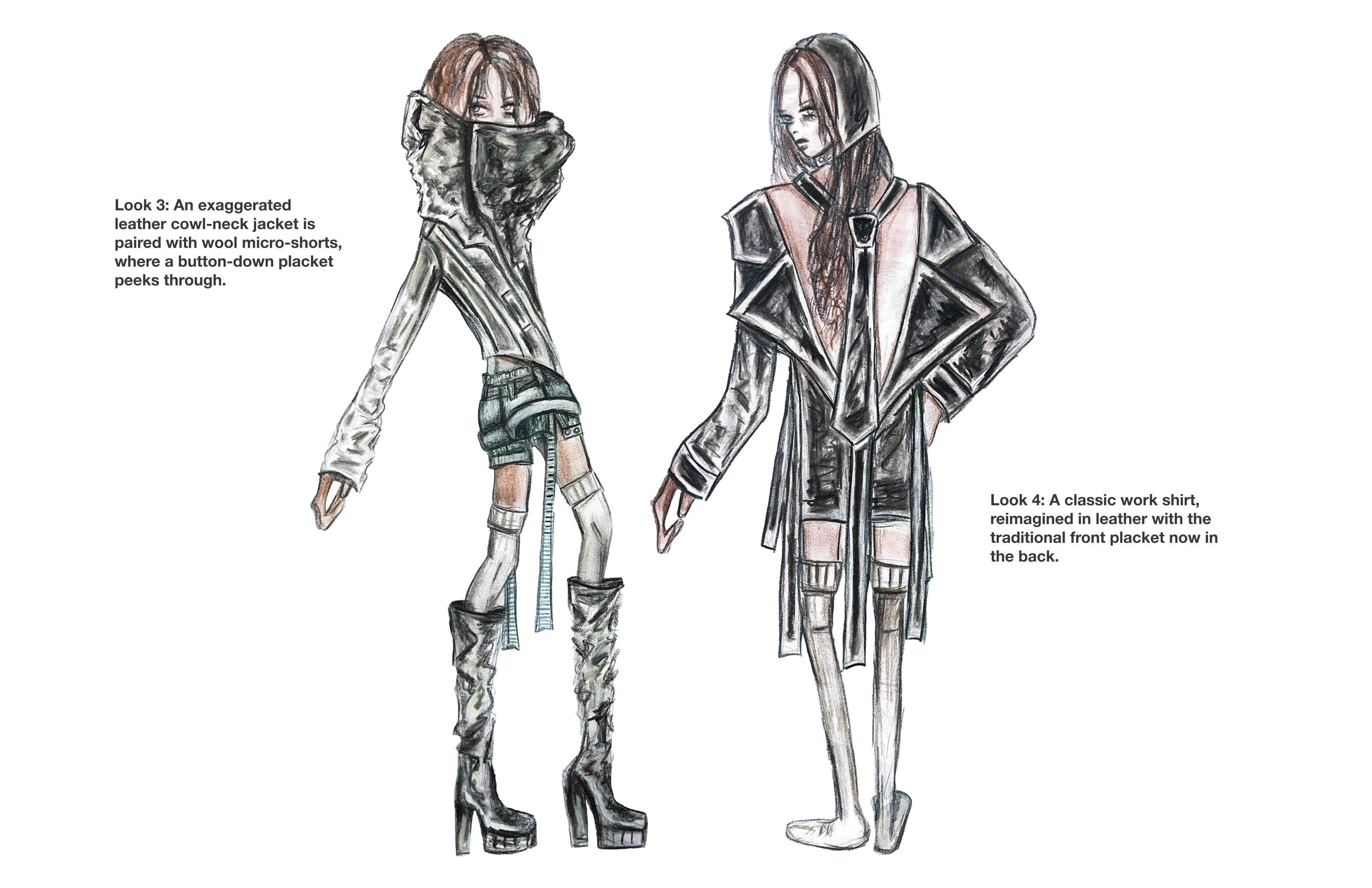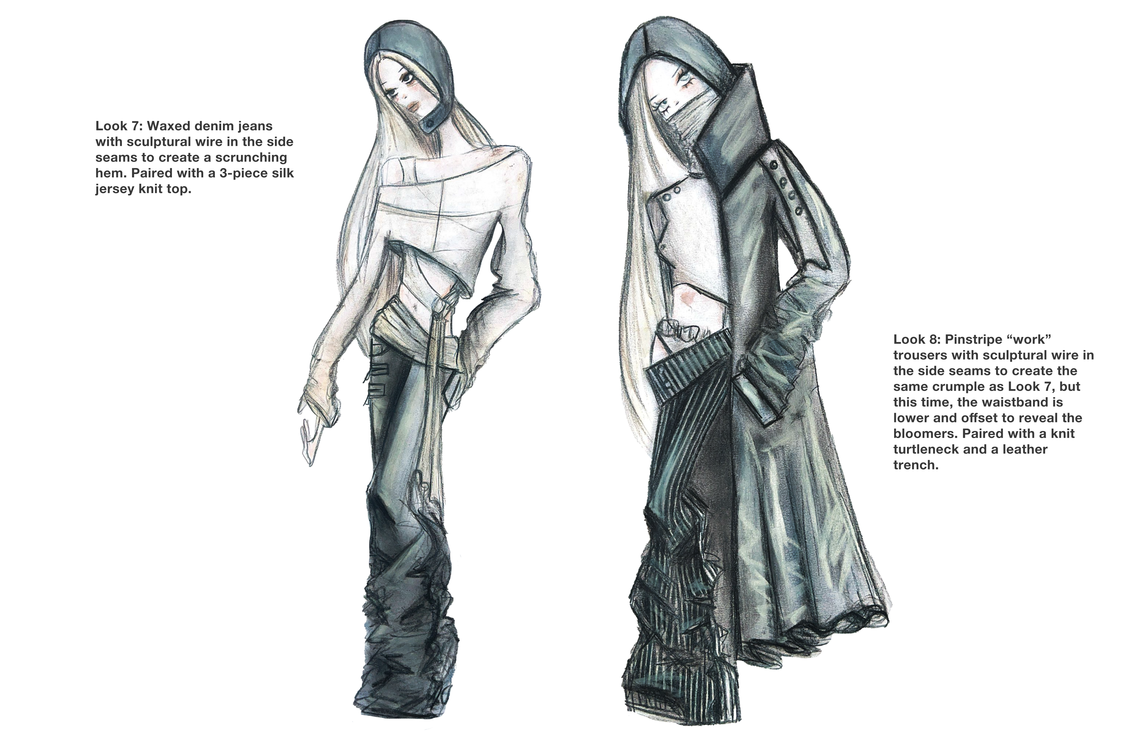 A study in tension and texture, this look pairs low-rise gunmetal waxed denim skinnies with sculptural wire embedded into the side seams, creating a crumpled, paper-like distortion that shifts with the body. The pants are grounded yet unruly—equal parts armor and collapse. On top, a deconstructed three-piece silk jersey knit ensemble plays with asymmetry and layering: a cropped dolman sleeve top drapes over a slashed, fitted underlayer, with a hanging raw hem tail, anchored by a gathered hip wrap. Together, the look captures a post-crisis silhouette—one that clings, folds, and reforms under pressure.