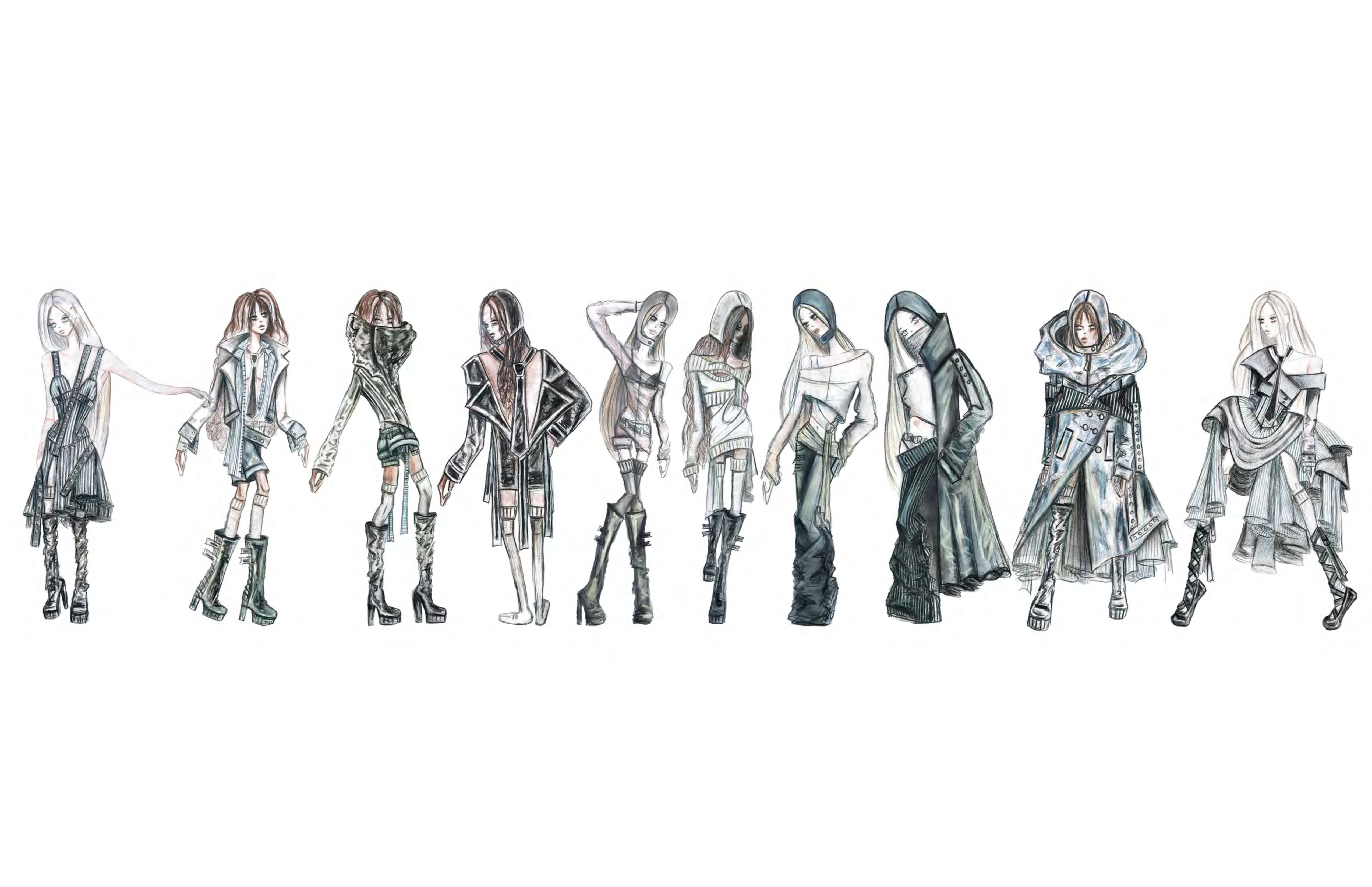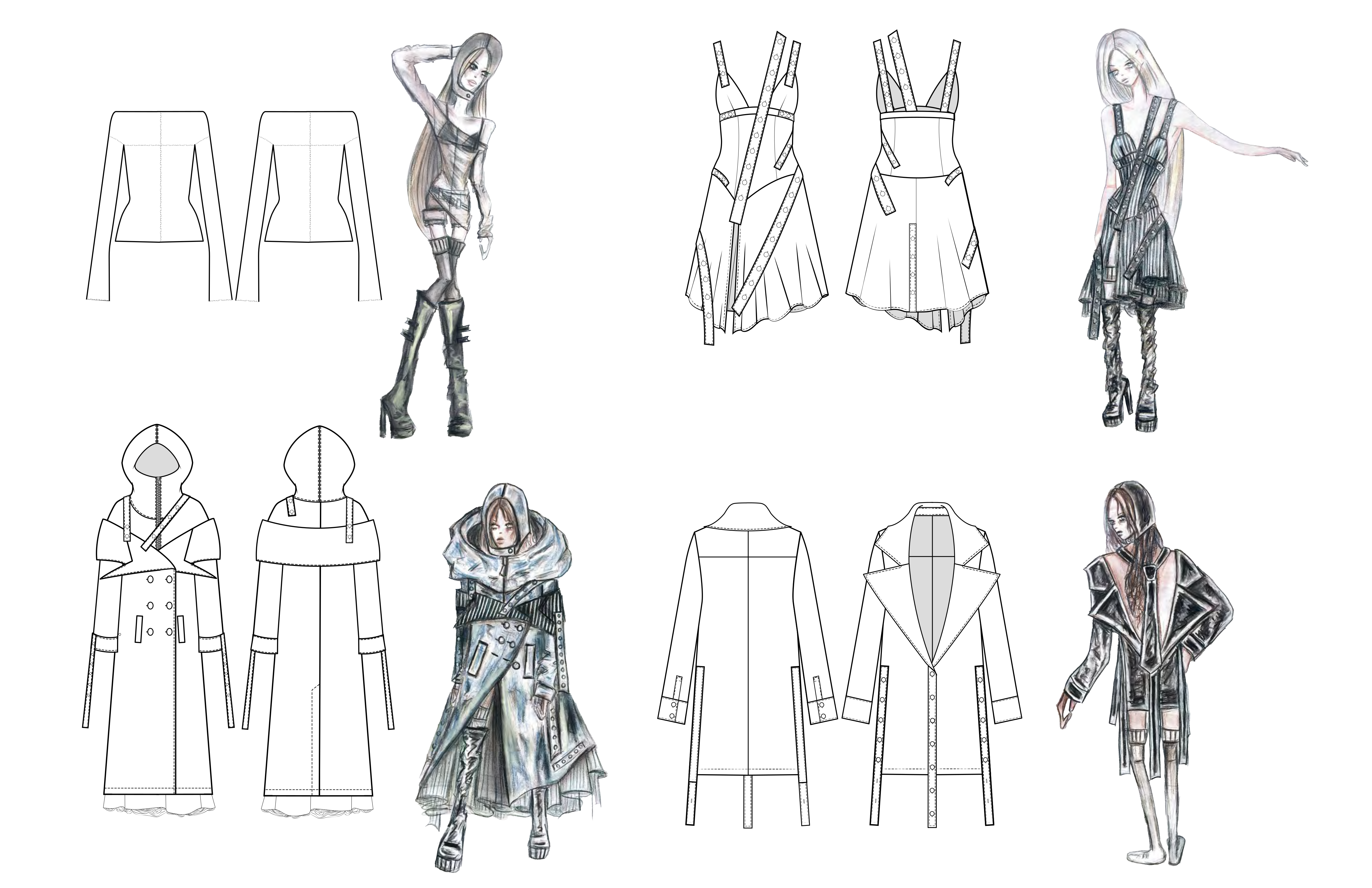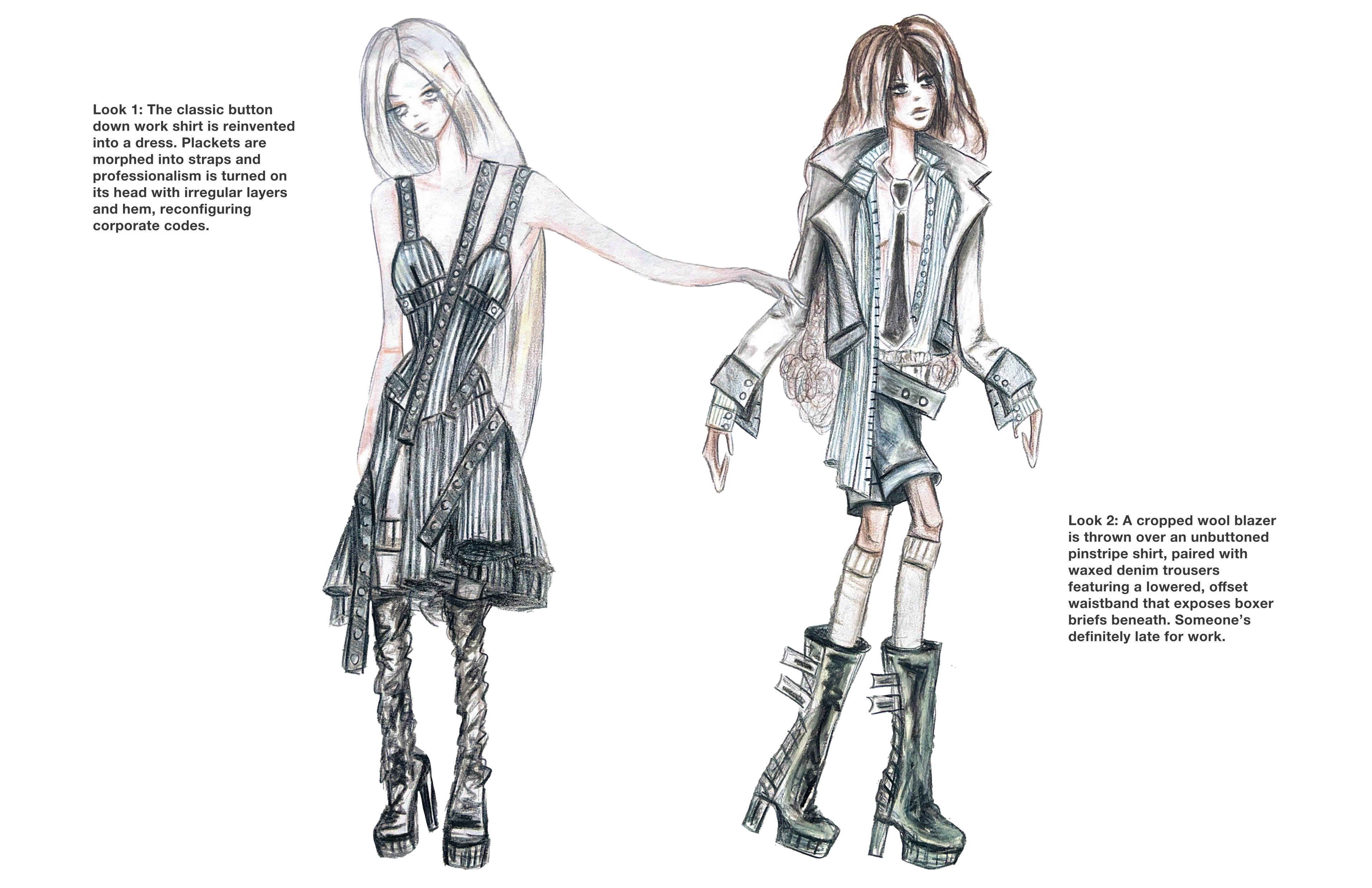 A study in tension and texture, this look pairs low-rise gunmetal waxed denim skinnies with sculptural wire embedded into the side seams, creating a crumpled, paper-like distortion that shifts with the body. The pants are grounded yet unruly—equal parts armor and collapse. On top, a deconstructed three-piece silk jersey knit ensemble plays with asymmetry and layering: a cropped dolman sleeve top drapes over a slashed, fitted underlayer, with a hanging raw hem tail, anchored by a gathered hip wrap. Together, the look captures a post-crisis silhouette—one that clings, folds, and reforms under pressure.